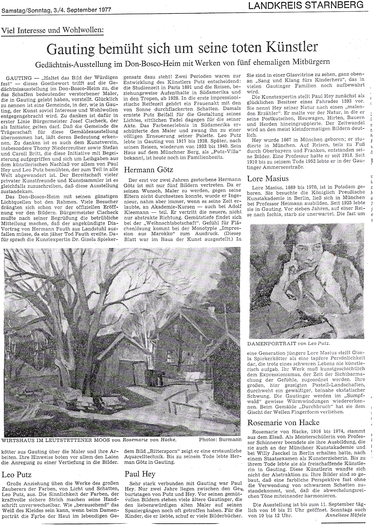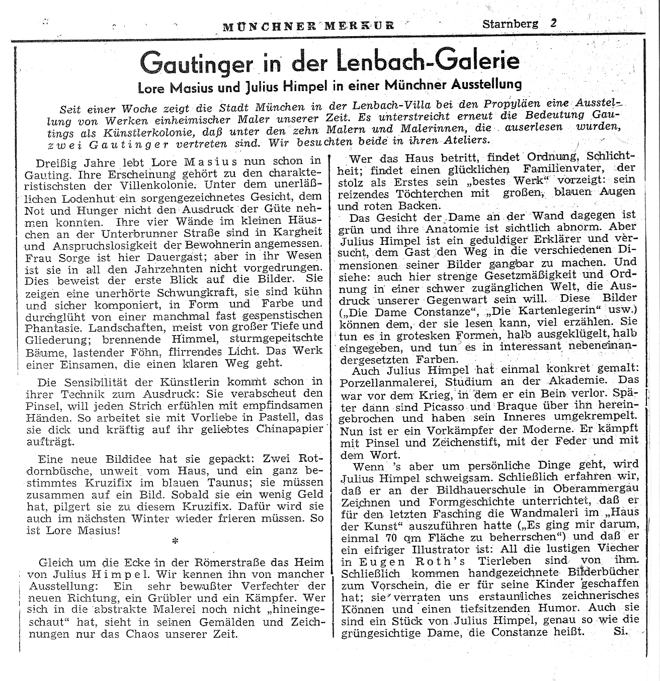 Münchner Merkur Lenbach Galerie1955 Kunstverein Mannheim 1957 Starnberg 1966 S.1 Starnberg 1966 S.2 Münchner Merkur 1967 Münchner Merkur 1969 Starnberg 1977 Süddeutsche 1989 Münchner Merkur 2009 Süddeutsche Zeitung Würmtal 2009